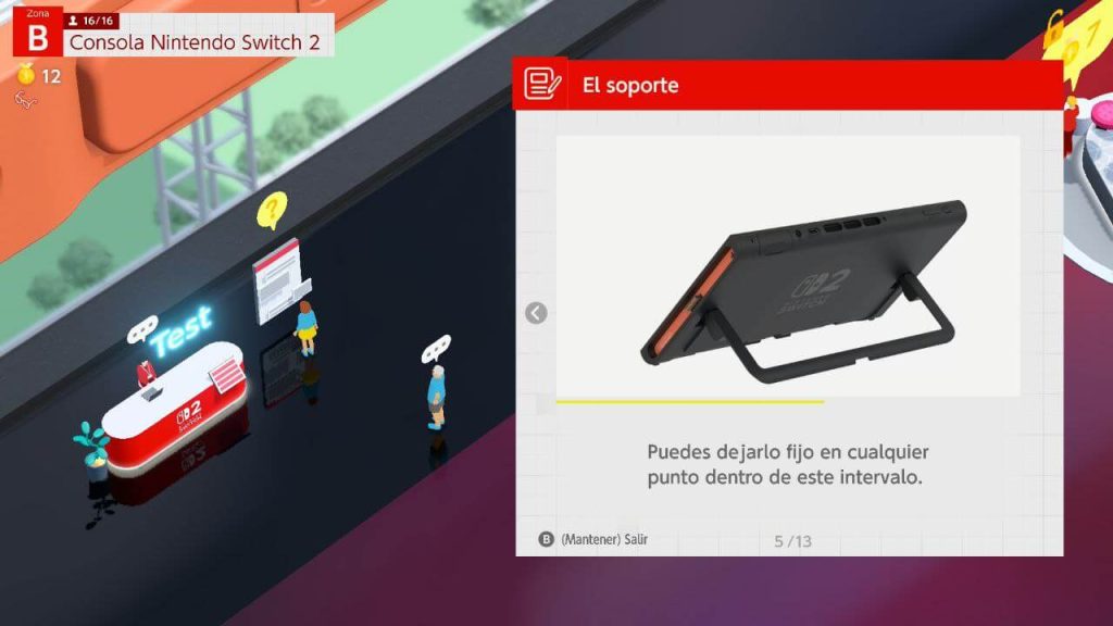 Algunos de los minijuegos que podremos encontrarnos serán como uno en el que, mediante el uso de la función de ratón del Joy-Con 2, deberemos controlar un OVNI y esquivar minas que caen del cielo a la vez que recogemos estrellas (minjuego al que me he enganchado) , averiguar la intensidad de una vibración mediante los Joy-Con 2 marcándolo en un gráfico, diferenciar entre tasas de refresco en una pantalla de 120hz, y algunos más. Otros serán bastante originales, ya que hacen uso completo de las funcionalidades de la consola. Incluso se llega a usar la pata trasera que sirve de soporte y tapa para la ranura de tarjetas microSD Express.
