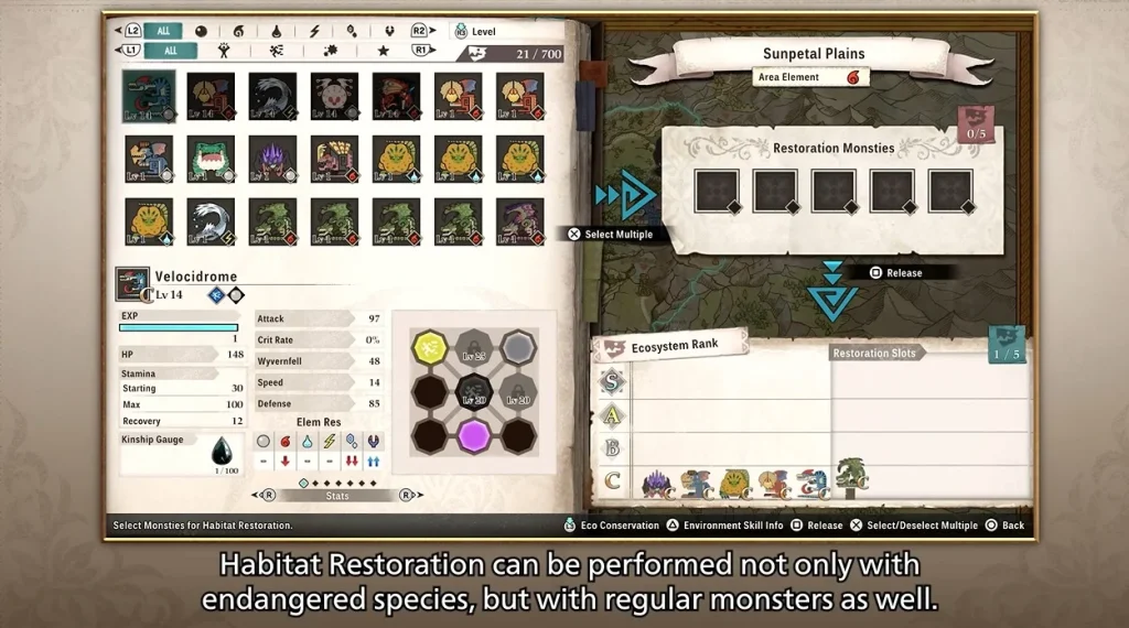 Liberar una especie en peligro de extinción aumentará la probabilidad de obtenerla en futuras guaridas. Incluso empezarán a aparecer subespecies o Mutantes, como la Rathian Maldita. Las especies de monstruos que no están en peligro también se pueden liberar. Permite aumentar el rango del ecosistema y obtener así huevos con mejores genes. Incluso es posible que estén imbuidos en el elemento del ecosistema en el que eclosionan.