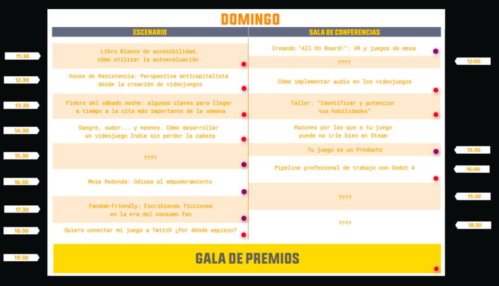 El horario de acceso a el IndieDevDay 2023 será de 10:30h a 20:00h. Durante el día, se realizarán diferentes charlas y actividades distribuidas en diferentes horas para así poder asistir a todas las que sean de interés propio. La página oficial avisa de que los horarios no son cien por cien seguros, puesto que nunca se sabe si pueden verse afectados por alguna modificación. Una vez tenemos en cuenta dicha información, vamos a echar un vistazo a su programa: